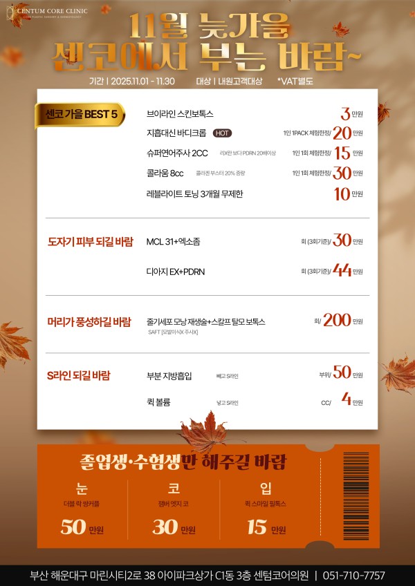 페이지 정보 작성자 최고관리자 댓글 0건 조회 209회 작성일 25-10-28 17:20 목록 본문 진행중 센텀코어의원 11월 이벤트 2025-10-28 ~ 2025-11-30 센텀코어의원 11월 이벤트 이미지 참고 이벤트 신청하기 이벤트 신청하기 다음글센텀코어의원 10월 이벤트 25.09.26 댓글 0 댓글목록 등록된 댓글이 없습니다.