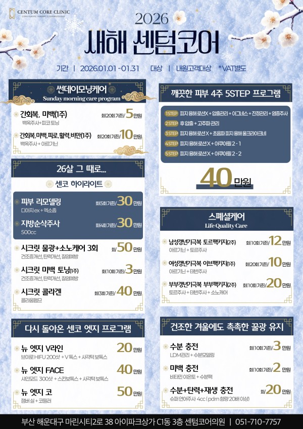페이지 정보 작성자 최고관리자 댓글 0건 조회 2회 작성일 25-12-31 12:21 목록 본문 진행중 센텀코어의원 새해 이벤트 2025-12-31 ~ 2026-01-31 센텀코어의원 새해 이벤트 이미지 참고 이벤트 신청하기 이벤트 신청하기 다음글센텀코어의원 12월 이벤트 25.12.01 댓글 0 댓글목록 등록된 댓글이 없습니다.