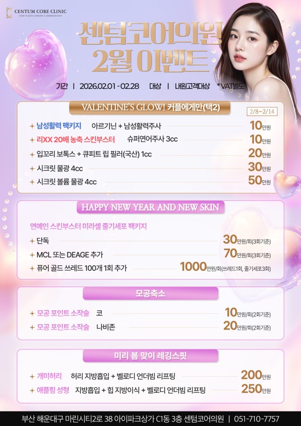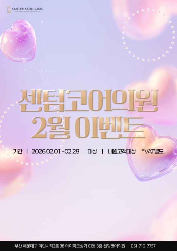 페이지 정보 작성자 최고관리자 댓글 0건 조회 57회 작성일 26-01-30 10:52 목록 본문 진행중 센텀코어의원 2월 이벤트 2026-01-30 ~ 2026-02-28 센텀코어의원 2월 이벤트 클릭시 확인하실 수 있습니다 이벤트 신청하기 이벤트 신청하기 다음글센텀코어의원 새해 이벤트 25.12.31 댓글 0 댓글목록 등록된 댓글이 없습니다.